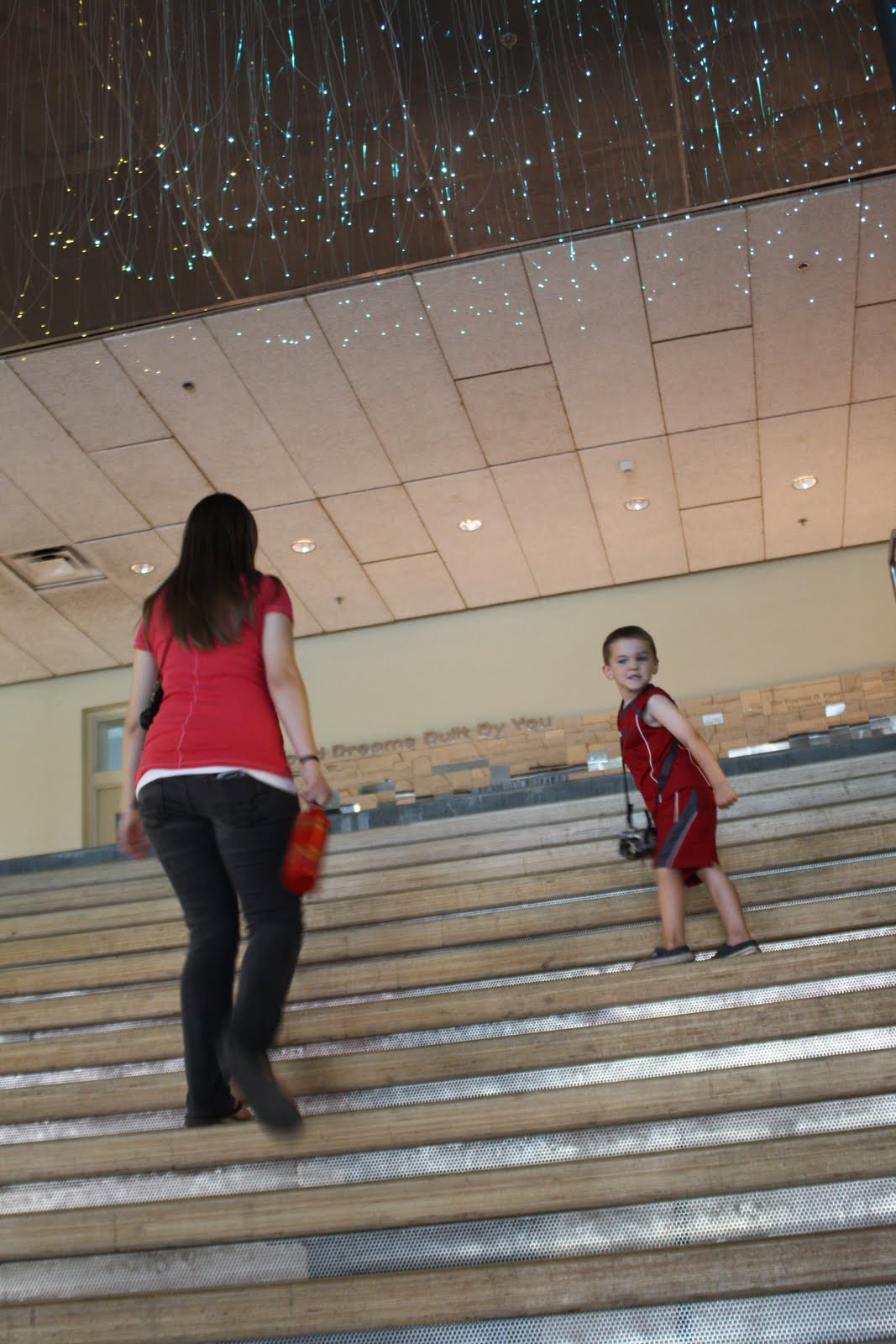 Here is my younger sister and nephew walking up the stairs, notice the light display above their heads. Beautiful. And, notice that camera around my nephew's neck? It's his when-I-visit-my-aunt-in-Phoenix-I-get-to-take-lots-of-pictures-with-her-old-digital-camera-because-I-like-taking-LOTS-of-pictures-camera.